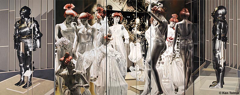 Knights and White Satin is the flagship painting of Ken Tolmies series of works on store window mannequins. Fifteen years from conception to completion, this massive oil on canvas is one of the most technically accomplished and conceptually bold works ever to be produced in Canada. The complexity of the subject-matter and the technical proficiency of the execution make a powerful statement about the continued cultural relevance of figurative art. Knights and White Satin draws on the resources of western art from the medieval to the modern periods, and combines them in what the artist calls a new humanism. Going beyond postmodern pastiche, these paintings are actually contemplative, presenting multiple layers of a single idea to the viewer, establishing continuities across time and space. The painting is composed like a triptych: it appears as one continuous shop window, although it is assembled from diverse materials -- a window display of lingerie from Harvey Nichols in London in the 1980s, and sixteenth-century German suits of armour on display at Torontos Royal Ontario Museum. The work is therefore what the anthropologist Claude Lévi-Strauss would call bricolage: a mixture of random elements pulled together as required, arguably the modus operandi of all postmodern people. By combining sixteenth-century armour with a 1980s window display, and by using the vocabulary of traditional realism in combination with surrealism and twentieth-century abstraction, Knights and White Satin paradoxically makes a unified statement about costume and gender identity across the ages. Mannequins have replaced human figures in Knights and White Satin, as in all of Tolmies recent major paintings. Their artificiality encourages the uninterrupted gaze without the ethical complications of gazing at actual people, but they retain enough residual humanity to attract our attention and model our desires. They allow the voyeuristic instinct of the contemporary consumer to focus on the intellectual and cultural content of paintings in a familiar way. The painting restates the adage that clothes make the man, or the woman: the objects alone signify gender in the complete absence of human bodies. The display of modern synthetic textiles, moulded plastic, and early modern metalwork -- all products of technical processes -- comments on the role of objects in the creation of human identity and gender. The juxtaposition of objects from disparate periods and places seems to create a timeless statement about male and female roles (the warrior male, the eroticized female). The historical specificity of the objects doesnt hinder us from reading them symbolically: we comprehend the armour although we no longer wear it. The painting thus makes a paradoxical statement about the process of reading objects symbolically: although the objects that we read change with history, the reading process doesnt. This painting has inspired a series of three watercolour studies that reproduces the entire painting. Back to Index Click to view a detail | |