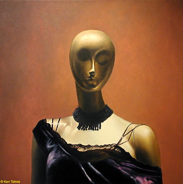 Store-Window MadonnaAlkyd and Acrylic on Canvas, Price: Inquire Store-Window Madonna belongs to the same group of paintings as The Annunciation, The Conversation, The Singing Angel, and the unfinished Mannequin. Like many of Ken Tolmies recent mannequin works, it is mixed media on canvas, underpainted in acrylic and finished in alkyd. The isolation and repose of the figure, and its full-frontal posture, connects it with icons of the Virgin, juxtaposing it with the bold scarlet figure of Cold, Cold Heart, a commercial Whore of Babylon. The serene and enigmatic head with its minimal features and downcast or closed eyes, inviting the gaze of the viewer without challenging it, recalls images of the idealized or abstract female face as diverse as those of Piero della Francesca (1420?-1492), Constantin Brancusi (1876-1956), Hepworth (1903-1975) or Picasso (1881-1973). The fact that this treatment, even of a mannequin in a store window, immediately invokes the sympathetic response of the viewer and creates the dummy as an object of pathos, goes to show the longevity of the Virgin as an icon, available as an archetype of femininity for over 2000 years. This painting, like all the recent mannequin works, reveals to us the persistence of cultural memory; it is strangely easy, almost automatic, for the contemporary viewer to impose an identity on the blankness of this metallic face. |