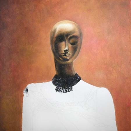 The background has been lightly scumbled in, and the artist has begun to sketch the figures necklace. Although the head is still in a preliminary stage, it is already acquiring a finished look and a metallic texture. This is a very exciting beginning: the mannequin has an abstract appearance, with echoes of Picasso.