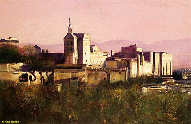 Palace of the Popes, AvignonDrybrush Watercolour on 300 lb Paper, This small watercolour conveys the mass of this medieval building as a series of simple mathematical forms. At the same time, the painting also conveys the buildings mass through contrast with the hazy, insubstantial hills and the lacy foliage in the foreground. |