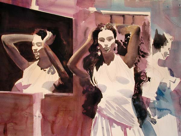 The artist has begun to apply the first layers of wet-on-wet background washes. He has selected magentas and blues for the highlights, and browns so suggest the shadows of the central figures hair and the reflection. The central figure has begun to emerge from the background, but the watercolour washes at this stage give the composition an abstract appearance.