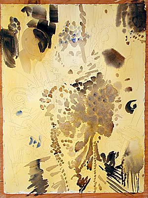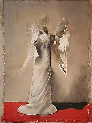 Using very wet 4-5" housepainters brushes, Tolmie applies a wash, or a suspension of pigment in water. Thanks to the large quantity of water, the paint flows over the entire paper surface, leaving no background white at all. Watercolour washes are applied in layers, either wet-on-wet so that the colours bleed together or wet-on-dry. For a warm background, Tolmie uses a yellow wash, and for a cooler background he uses a blue wash. Note how differently coloured washes create different moods in The Ice Queen: Study (left) and The Singing Angel (right). |