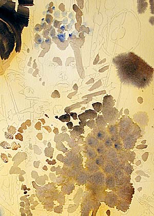 The Ice Queen: Study (Detail): the darker washes bleed over the lines of the drawing