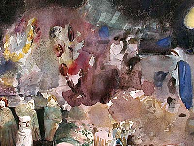 Still using a wide, wet brush, Tolmie applies multiple (in some cases up to 20-30) transparent layers of wet-on-wet wash. Dark colours are laid onto lighter ones and colours bleed over the lines of the drawing, effacing the drawing in all but the lightest parts of the painting. Indeed, Tolmie deliberately sets out to obscure detail: his goal in this stage is to establish the paintings tone, the juxtaposition of light and dark that is the source of the energy he values so highly. Detail can be reimposed at a later stage. |