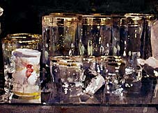 Typically, Tolmie will begin a painting by performing all of the stages at once on an individual element; this element becomes a key, establishing the paintings tonal range from lightest to darkest. Once the underpainting is accomplished, the artists task is to bring the rest of the painting up to the level of finish already achieved with this key. This procedure is clearly illustrated by the early stages of Santons: the small jewels near the bottom of the painting were among the first things to be painted. |