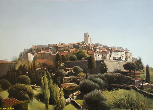 St Paul de VenceAlkyd on Canvas, This townscape of St Paul de Vence shows an interest in simple masses and geometry that recalls Cubism, but at the same time has a clarity, lightness, and graphic quality that suggest formal neoclassical landscapes like those of Nicolas Poussin (1594-1665) and Gustave Courbet (1819-1877). The treatment of the southern French and Italian landscape by Jean-Baptiste-Camille Corot (1796-1875) occupied a similar middle ground. Many important European artists of the 20th century, notably Marc Chagall (1887-1985), spent some time in or near St Paul de Vence, so the location is of interest to the artist as much for its artistic importance as for its landscape and classical architecture. |